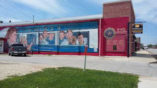 The Wagon Wheel motel was very comfy but the fridge didnt work so the milk went off. Oh gee that meant we had to go out for breaky. After a late start we went to Shellys cafe where we had biscuits and gravey for breaky. Not quite breaky fare. But eggs and bacon were delicious as was the cuppa. Biscuits, or as we would call them were lovely on their own with butter and jam, oops, jelly!! Then Brian headed off in the car to see the biggest rocking chair, Bobs gasoline alley, the Vacuum cleaner museum and of course the murals of Cuba. Meanwhile I walked through the town, viewing the murals- 13 in all, the museum, no one there and school kids get credit for doing displays!! The library where I got some advice on more US authors and used the computers to answer a few emails. Shopping and back to base for a cuppa and a cookie.